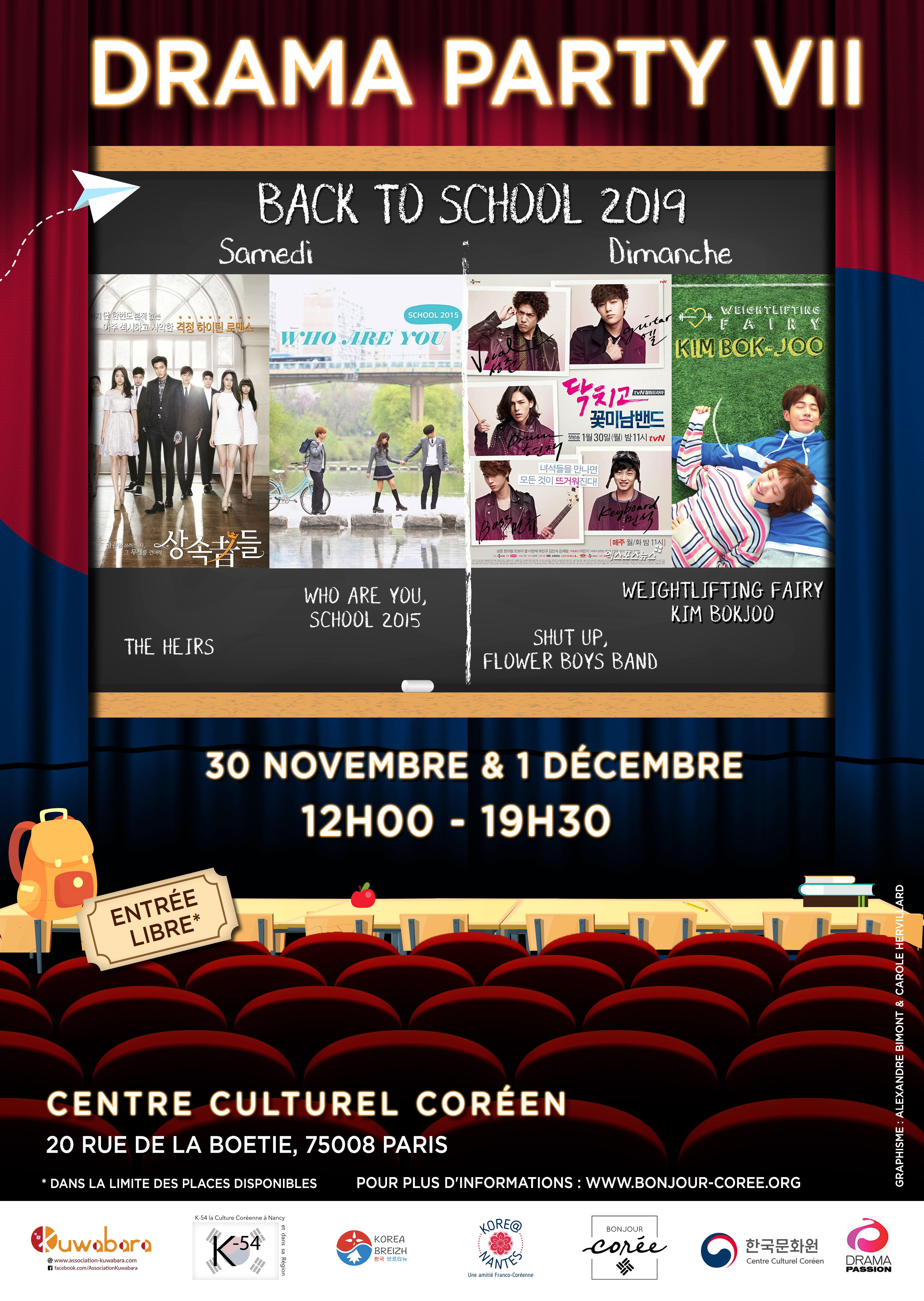 Cette année encore, Bonjour Corée vous invite à sa Drama Party ! Pour sa septième édition, Bonjour Corée ainsi que ses partenaires le Centre Culturel Coréen, Drama Passion et Gong TV diffuseront des dramas autour du thème “Back To School” (retour à l’école) de la scolarité coréenne.