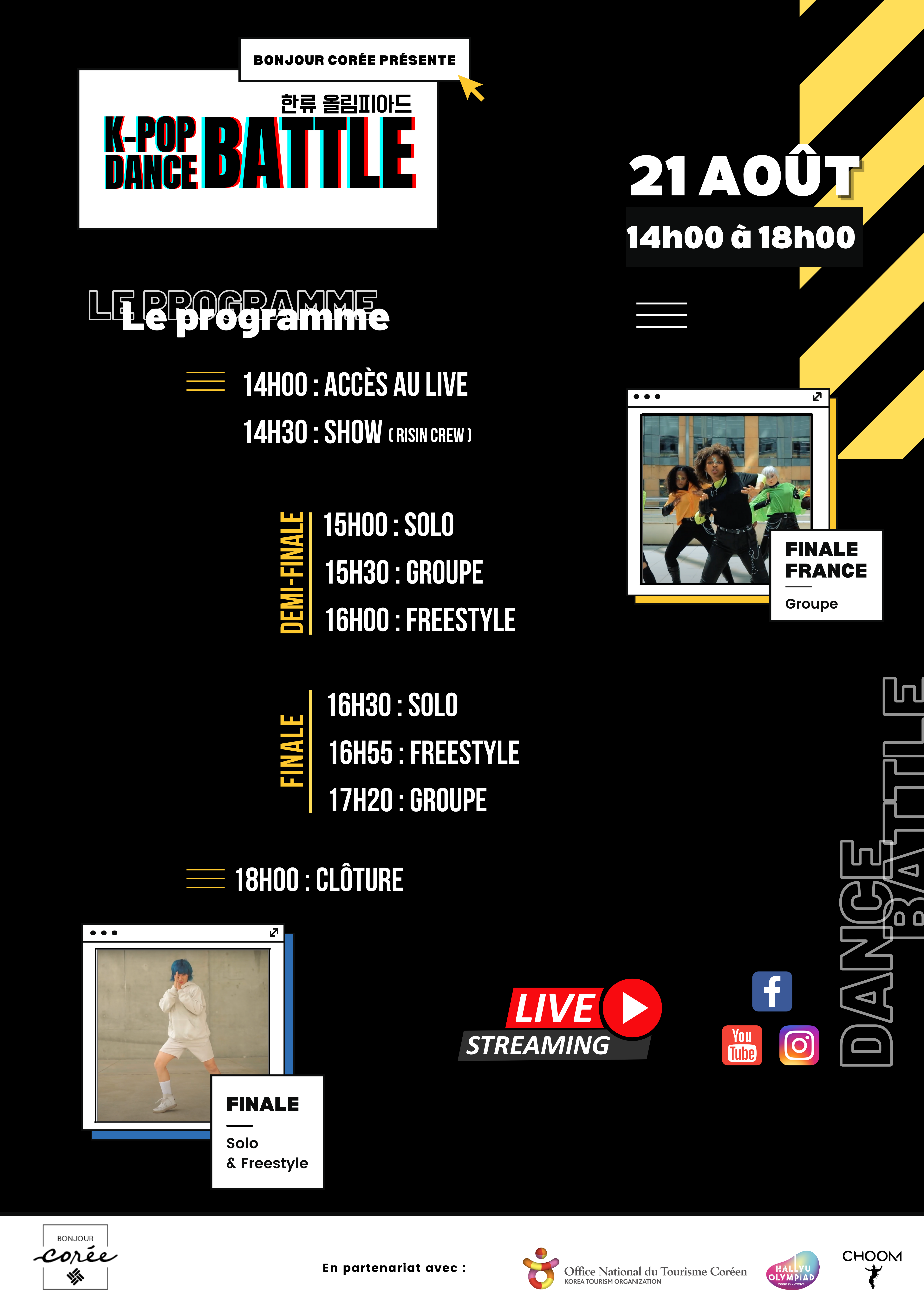 Les finalistes de chaque catégorie s’affronteront lors de battles de danse sur de la musique K-Pop. Ce sera alors aux trois jurés de décider du vainqueur des catégories “Solo”, “Groupe” et “Freestyle” !