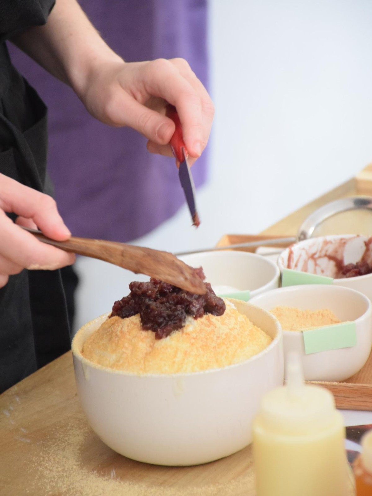 Après la présentation et une démonstration de Minae, il était temps pour nous de se mettre au travail. La petite touche en plus : la personne qui réalisera le plus beau bingsu gagnera un prix. Nous avions le choix entre deux toppings : haricots rouges ou mangue. J’ai personnellement choisi de réaliser le bingsu traditionnel pour débuter avec la base de la base.