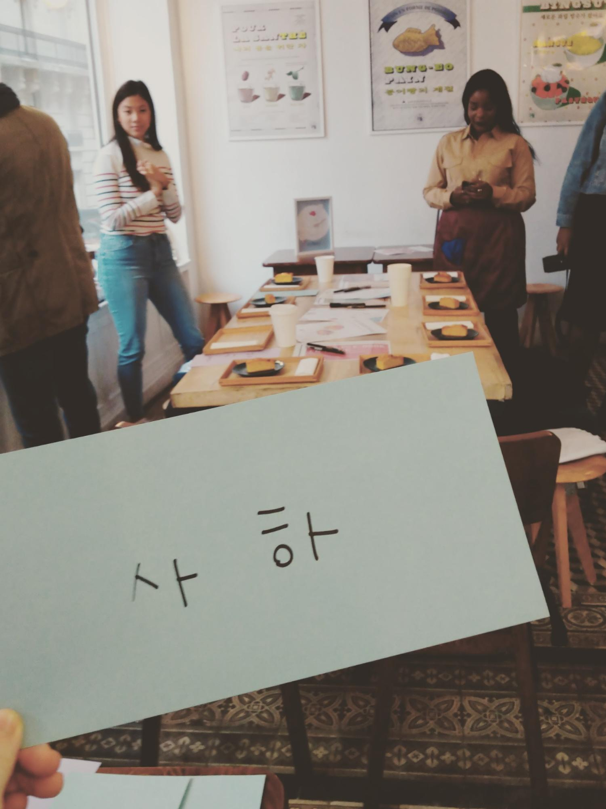 Tout a alors commencé avec un petit jeu : trouver son prénom écrit en coréen pour avoir accès à la tablée. Saurez-vous deviner comment je m’appelle ?