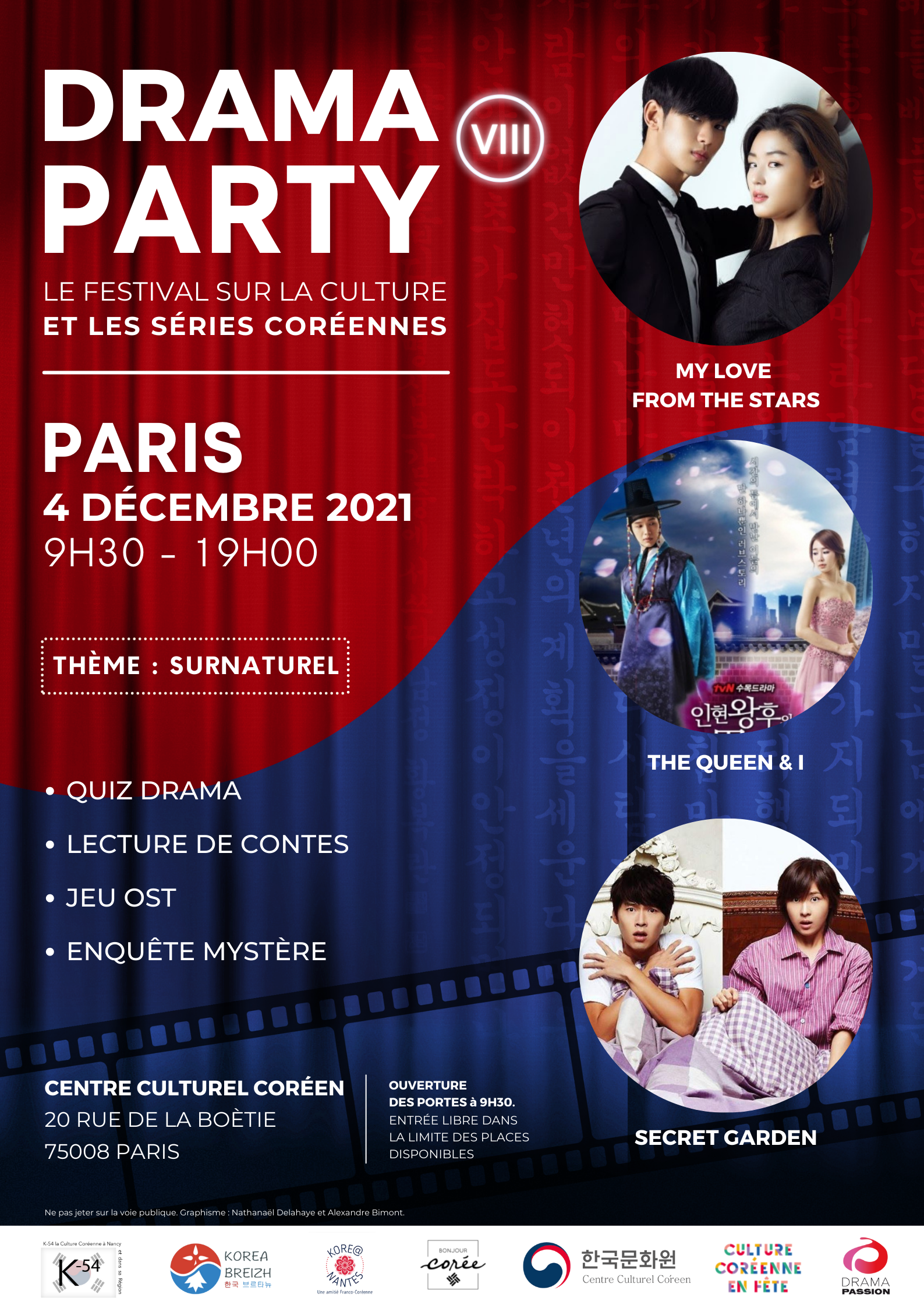 Cet événement réalisé en partenariat avec le Centre Culturel Coréen et Drama Passion est le rendez-vous annuel des amateurs de séries coréennes ! Beaucoup d’entre vous ont découvert la Corée du Sud et sa culture via les dramas. Ces séries télévisées sont principalement disponibles sur les sites de streaming comme Drama Passion, avec des sous-titrages en anglais, d’autres en français et pour les plus courageux (et les moins patients) en version originale.
