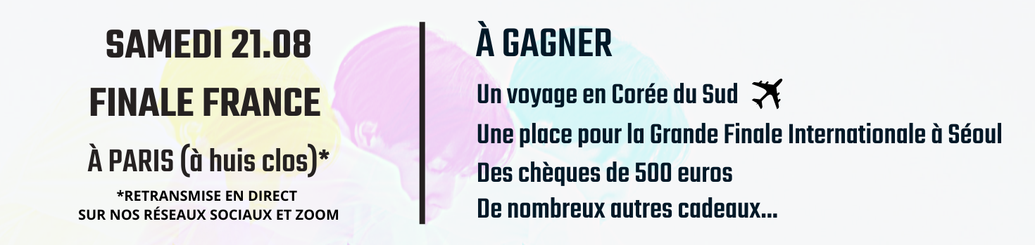 Ce concours mettra en compétition des talents sur 3 catégories de battles : “Groupe”, “Solo” et “Freestyle”, avec des cadeaux exceptionnels à la clé, dont un VOYAGE EN CORÉE DU SUD !
