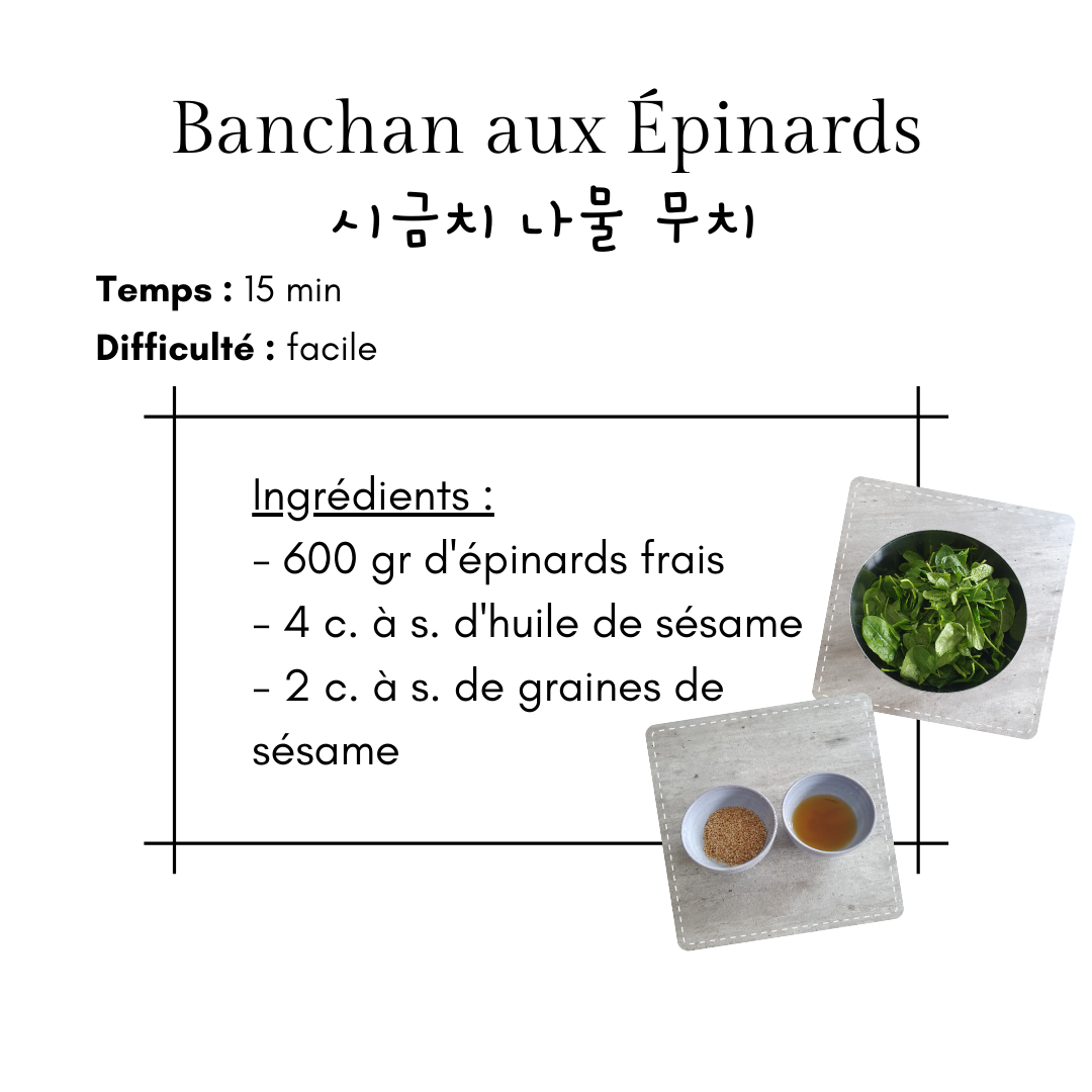 Nous connaissons tous le kimchi (김치) comme banchan (반찬 – plat d’accompagnement) servit avec les plats coréens. Cheffe Elyna te propose cette fois-ci de faire un autre type de banchan également très populaire, celui aux épinards (시금치 나물 무치).